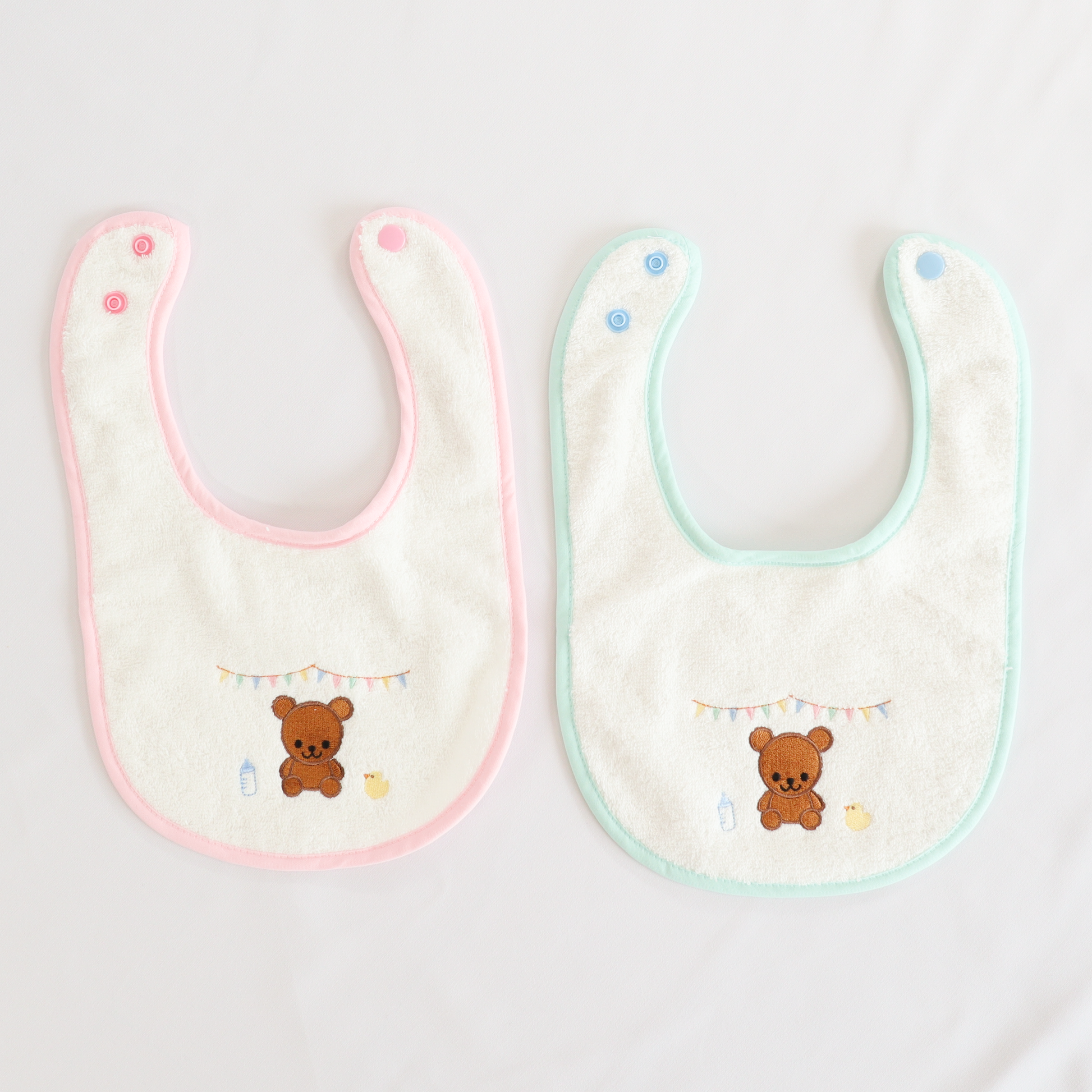 ◯ガーゼ(タグのくまの服色水色)+スタイ(ミント)+ミトン(紺)