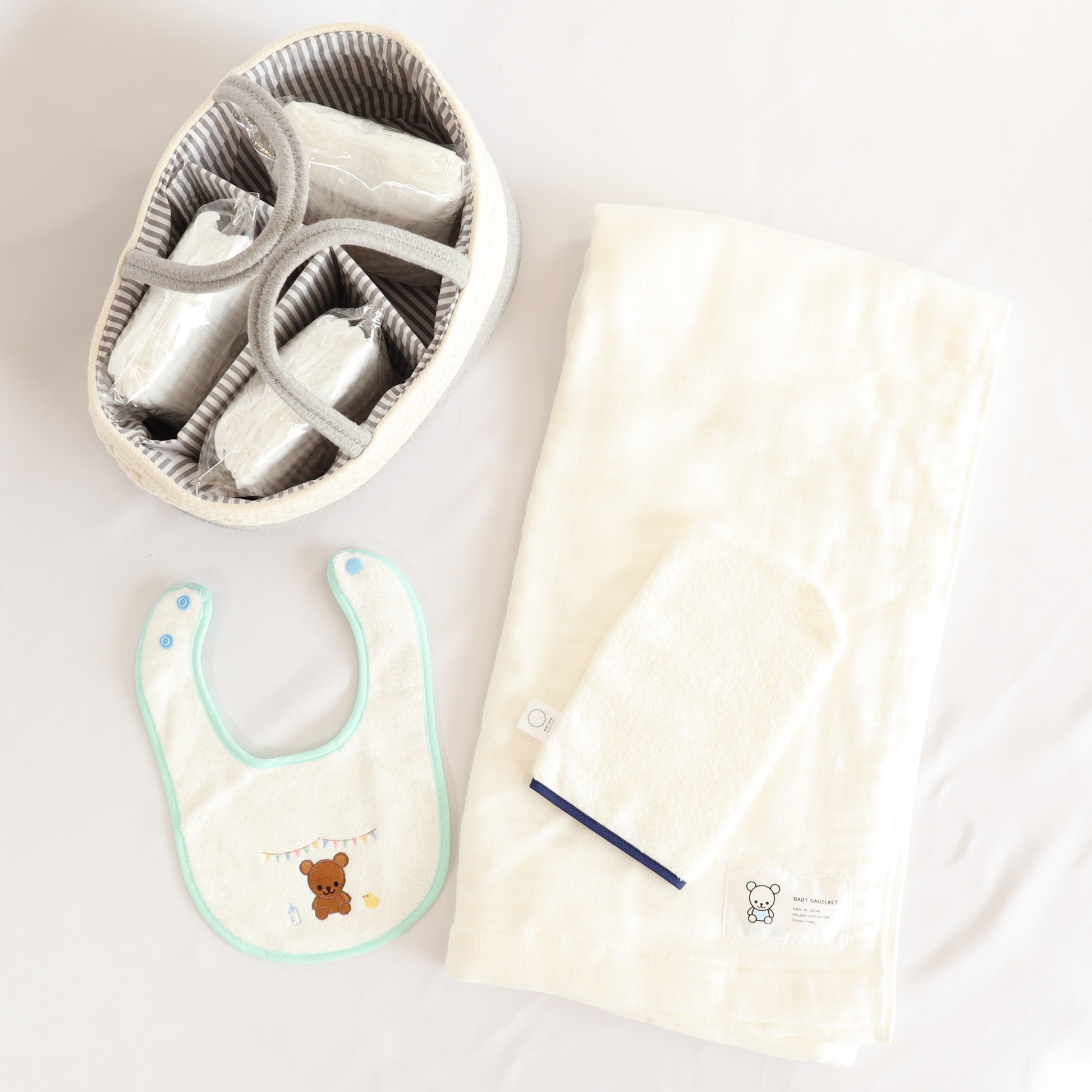 ママも嬉しい 沐浴プレミアムセット(ガーゼバスタオル+スタイ+ミトン+おむつストッカー+オムツ) ※送料無料
