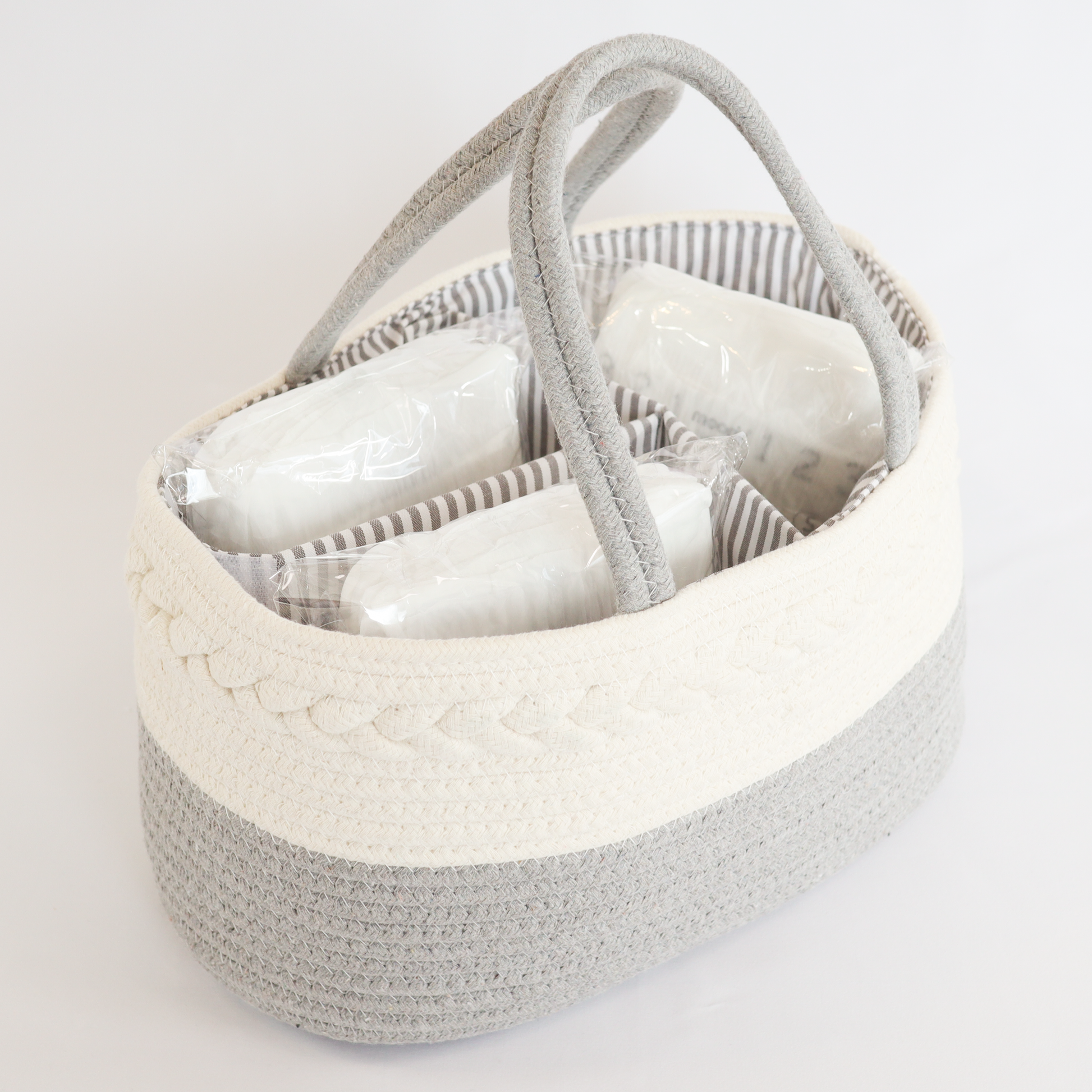 おむつストッカーバスケットは、おむつなどを入れて持ち運びに大活躍。大変な子育てに重宝する便利グッズです。