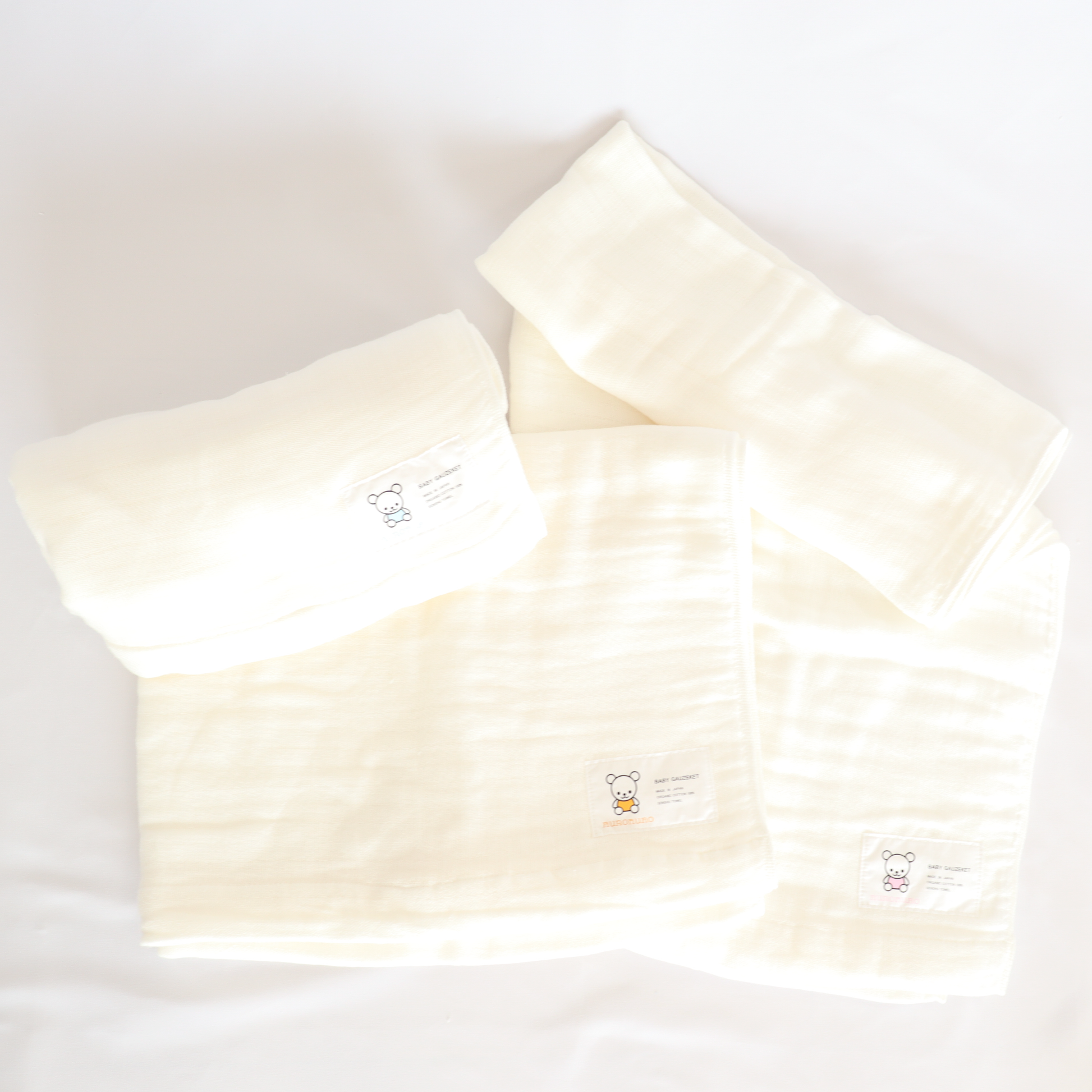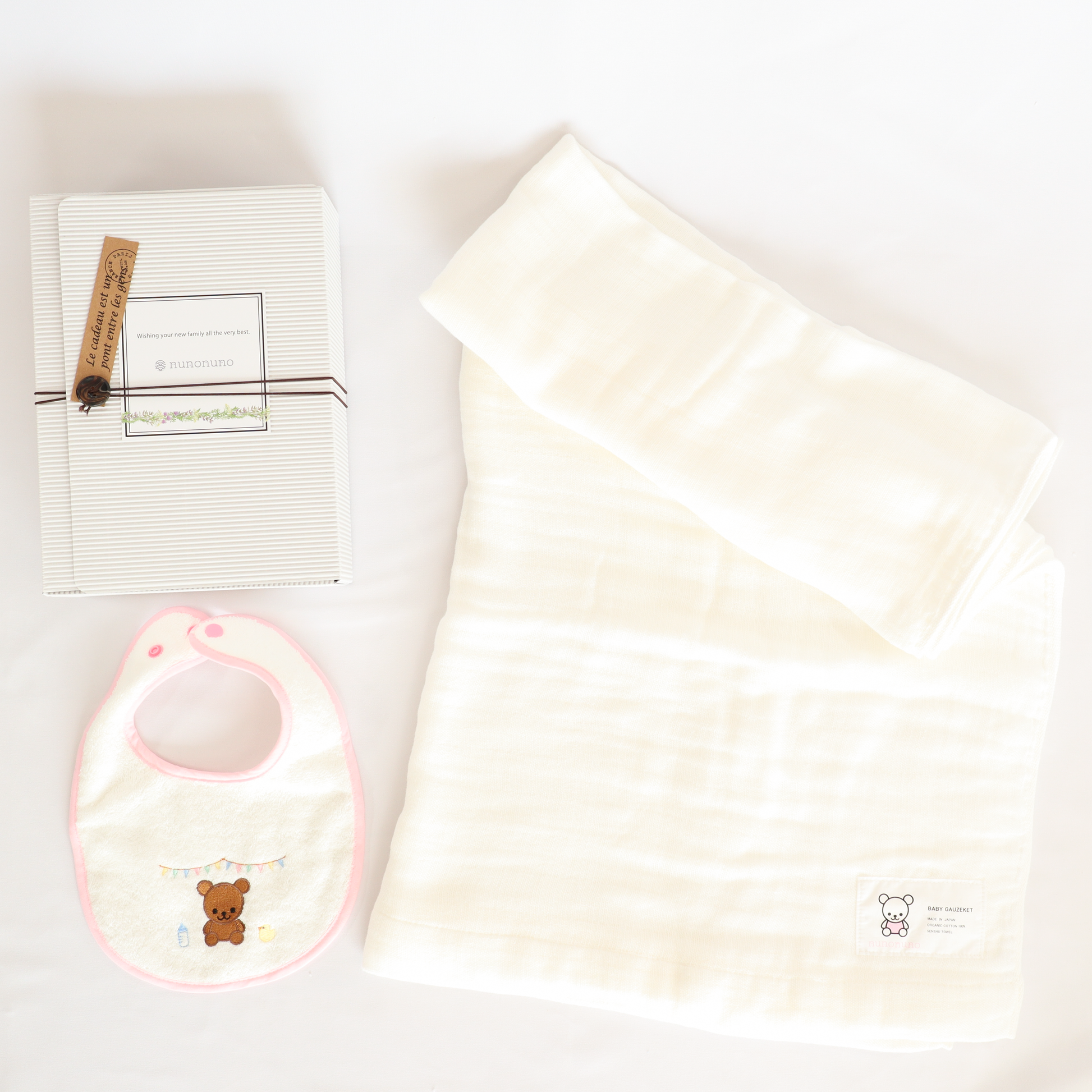 赤ちゃんの肌をやさしく包む、オーガニックコットン100%泉州タオルのガーゼバスタオルとスタイの2点ギフトセット。